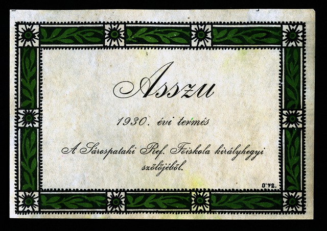 Kun, Zsanett (Digitalizáló): Asszú 1930. évi termés A Sárospataki Ref. Főiskola királyhegyi szőlőjéből. 0'72. (Publikálatlan) (2023)