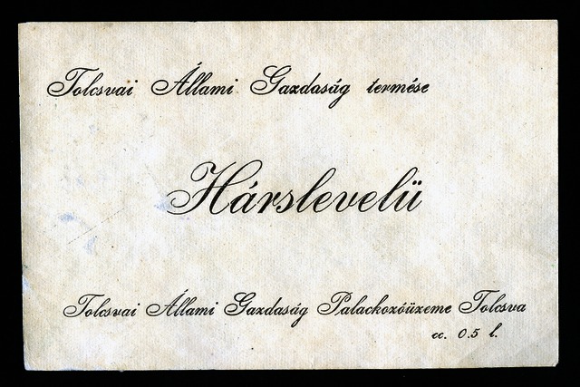 Bortípus: hárslevelű; Termelő neve: Tolcsvai Állami Gazdaság ; Termelő címe: Tolcsva; Évjárat: 1949 után; monokróm címke