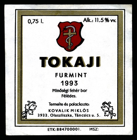 Bortípus: furmint; Termelő neve: Kovalik Miklós; Termelő címe: Olaszliszka, Táncsics út 5; Évjárat: 1993; színes címke