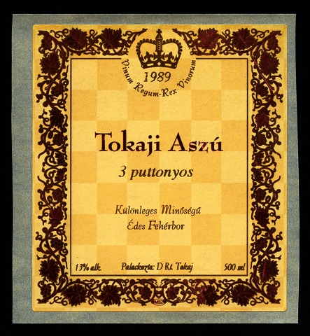 Kun, Zsanett (Digitalizáló): Vinum Regnum Rex Vinorum 1989 Tokaji Aszú 3 puttonyos Különleges Minőségű Édes Fehérbor 13% alk. Palackozta D Rt. Tokaj 500 ml (MSZ). (Publikálatlan) (2023)