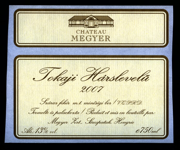 Kun, Zsanett (Digitalizáló): Chateau Megyer Tokaji Hárslevelű 2007 Száraz fehér m.t. minőségi bor / V.Q.P.R.D. Termelte és palackozta / Produit et mis en bouteille par: Megyer Zrt., Sárospatak, Hongrie Alc.: 13% vol. e 750 ml. (Publikálatlan) (2023)