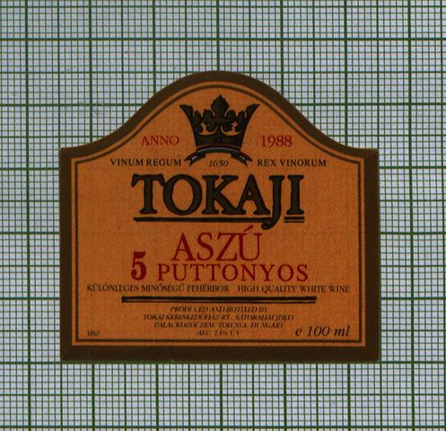 Bortípus: asszú; Termelő neve: Tokaj Kereskedőház Rt.; Termelő címe: Sátoraljaújhely, Mártírok útja 23-25; Évjárat: 1988; színes címke