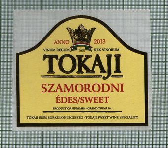 Bortípus: szamorodni; Termelő neve: Grand Tokaj Zrt.; Termelő címe: Tolcsva, Petőfi S. u. 36-40.; Évjárat: 2013; színes címke