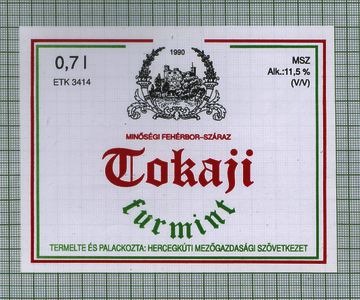 Bihari, Sándor (Digitalizáló): 1990 Minőségi Fehérbor-Száraz Tokaji furmint Termelte: Hercegkúti Mezőgazdasági Szövetkezet 0,7 l MSZ Alk.: 11,5% (V/V) ETK 3414. (Publikálatlan) (2023)