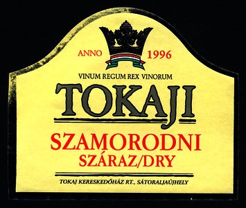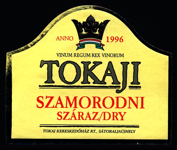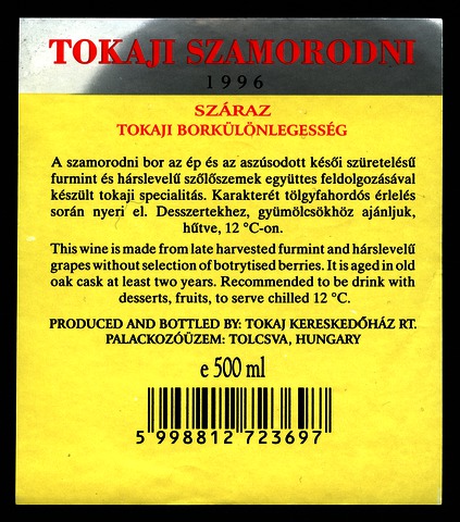 Bortípus: szamorodni; Termelő neve: Tokaj Kereskedőház Rt.; Termelő címe: 3934 Tolcsva, Petőfi út 36-40.; Évjárat: 1996; színes címke
