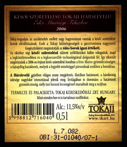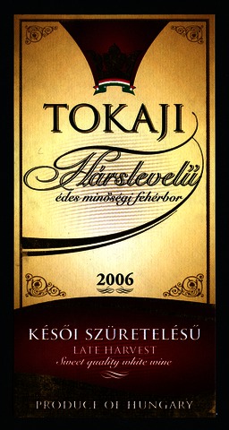 Bortípus: hárslevelű; Termelő neve: Tokaj Kereskedőház Zrt.; Évjárat: 2006; színes címke