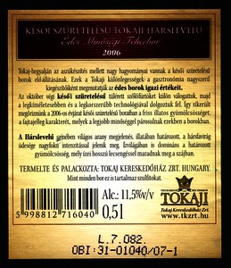 Kun, Zsanett (Digitalizáló): 2006-os tokaji késői szüretelésű hárslevelű boroscímke a Tokaj Kereskedőház Zrt.-től. (Publikálatlan) (2024)