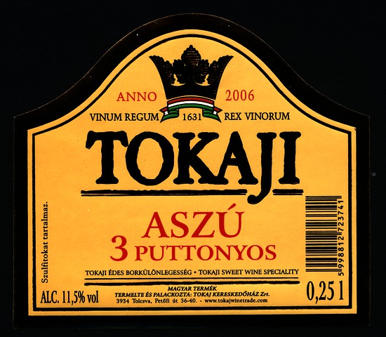 Bortípus: aszú; Termelő neve: Tokaj Kereskedőház Zrt.; Termelő címe: 3934 Tolcsva, Petőfi út 36-40.; Évjárat: 2006; színes címke