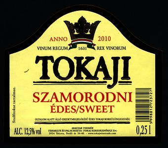 Bortípus: szamorodni; Termelő neve: Tokaj Kereskedőház Zrt.; Termelő címe: 3934 Tolcsva, Petőfi út 36-40.; Évjárat: 2010; színes címke