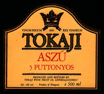 Bortípus: aszú; Termelő neve: Tokaji Wine Trust Co.; Termelő címe: Sátoraljaújhely; színes címke