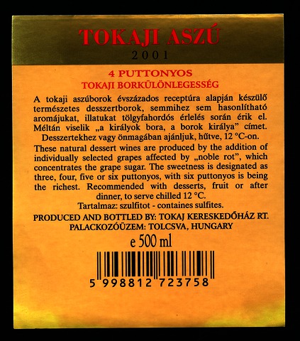 Bortípus: aszú; Termelő neve: Tokaj Kereskedőház Rt.; Termelő címe: Sátoraljaújhely; Évjárat: 2001; színes címke