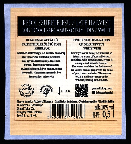 Bortípus: sárga muskotály; Termelő neve: Grand Tokaj Zrt.; Termelő címe: 3934 Tolcsva, Petőfi S. u. 36-40.; Évjárat: 2017; színes címke