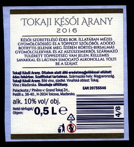 Bortípus: késői arany; Termelő neve: Grand Tokaj Zrt.; Termelő címe: 3934 Tolcsva, Petőfi S. u. 36-40.; Évjárat: 2016; színes címke