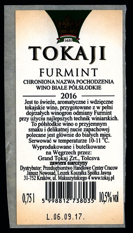 Bortípus: furmint; Termelő neve: Grand Tokaj Zrt.; Termelő címe: Tolcsva; Évjárat: 2016; színes címke
