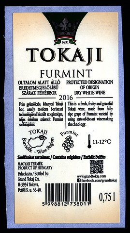 Bortípus: furmint; Termelő neve: Grand Tokaj Zrt.; Termelő címe: 3934 Tolcsva, Petőfi S. u. 36-40.; Évjárat: 2017; színes címke