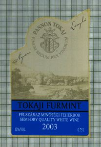 Bortípus: furmint; Termelő neve: Pannon Tokaj Pincészet; Termelő címe: Tolcsva, Arany J. utca 14.; Évjárat: 2003; színes címke