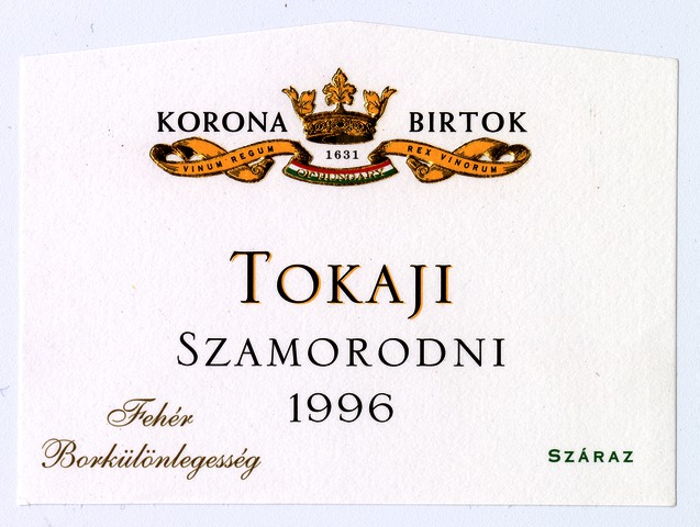 Bortípus: szamorodni; Termelő neve: Tokaj Kereskedőház Rt.; Termelő címe: Sátoraljaújhely; Évjárat: 1996; színes címke