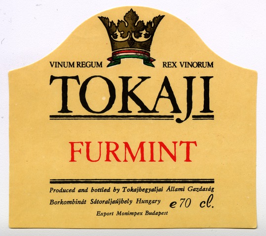 Bortípus: furmint; Termelő neve: Tokajhegyaljai Állami Gazdasági Borkombinát; Termelő címe: Sátoraljaújhely; színes címke