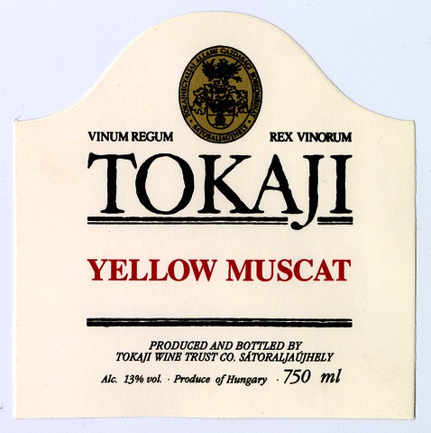 Bortípus: sárga muskotály; Termelő neve: Tokajhegyaljai Állami Gazdasági Borkombinát; Termelő címe: Sátoraljaújhely; színes címke
