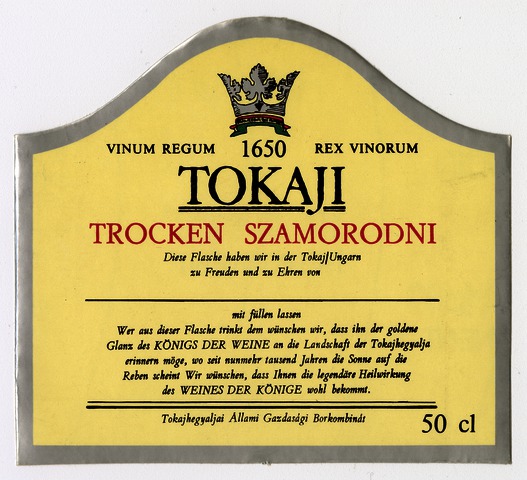 Bortípus: szamorodni; Termelő neve: Tokajhegyaljai Állami Gazdasági Borkombinát; színes címke