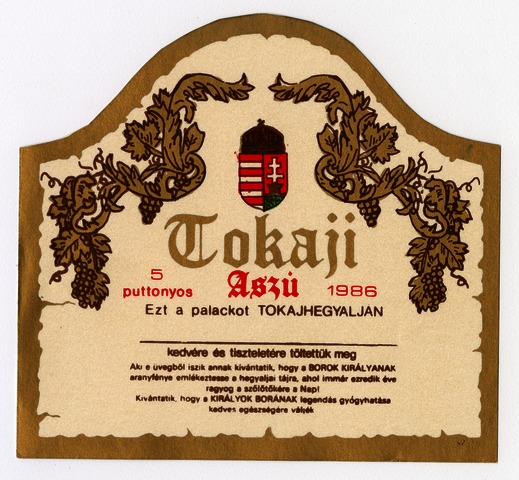 Kun, Zsanett (Digitalizáló): 1986-os 5 puttonyos tokaji aszú boroscímke. (Publikálatlan) (2024)