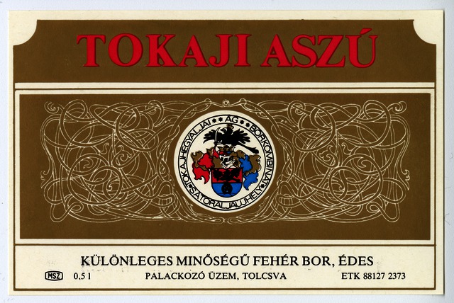 Bortípus: aszú; Termelő neve: Tokajhegyaljai Állami Gazdasági Borkombinát; Termelő címe: Sátoraljaújhely; színes címke