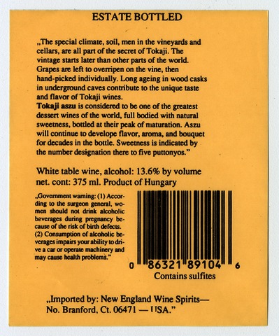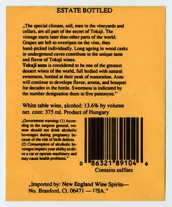 New England Wine Spirits import tokaji aszú hátcímke