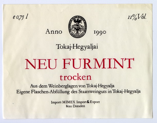 Bortípus: furmint; Termelő neve: Tokajhegyaljai Állami Gazdasági Borkombinát; Termelő címe: Sátoraljaújhely; színes címke