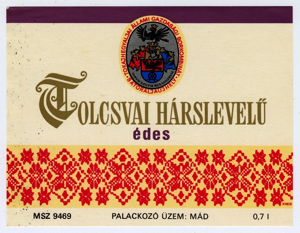 Kun, Zsanett (Digitalizáló): Tolcsvai édes hárslevelű boroscímke a Tokajhegyaljai Állami Gazdasági Borkombináttól. (Publikálatlan) (2024)