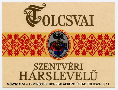 Tolcsvai szentvéri hárslelvelű boroscímke a Tokajhegyaljai Állami Gazdasági Borkombináttól