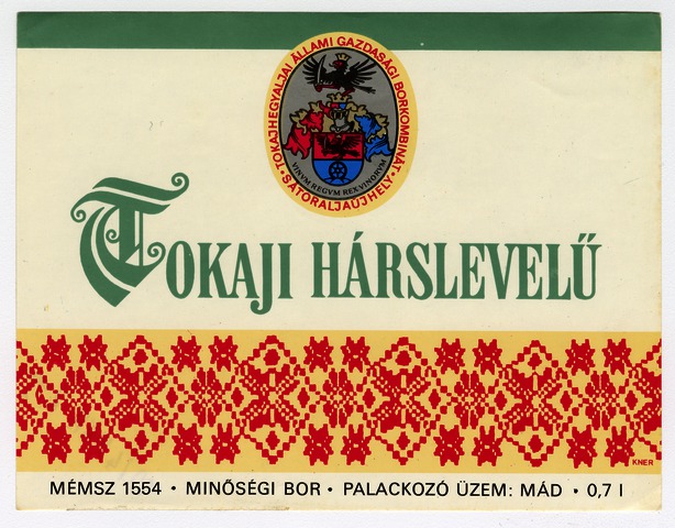 Bortípus: hárslevelű; Termelő neve: Tokajhegyaljai Állami Gazdasági Borkombinát; Termelő címe: Sátoraljaújhely; színes címke