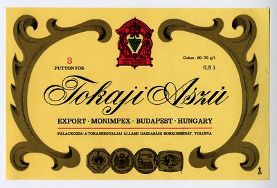 Bortípus: szamorodni; Termelő neve: Tokajhegyaljai Állami Gazdasági Borkombinát; Termelő címe: Sátoraljaújhely; színes címke