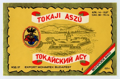 Bortípus: aszú; Termelő neve: Tokajhegyaljai Állami Gazdasági Borkombinát; Termelő címe: Sátoraljaújhely; színes címke