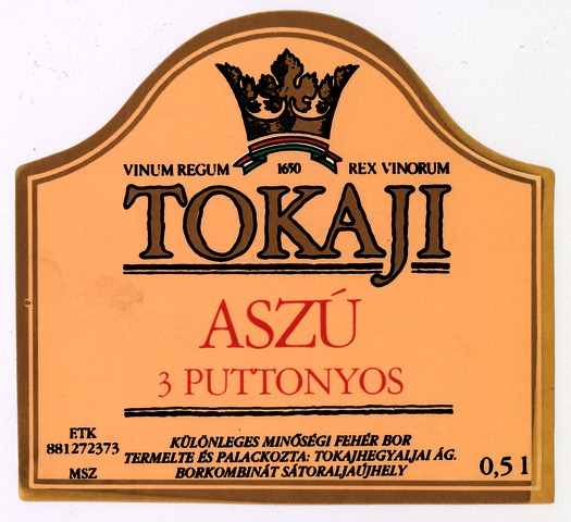 Bortípus: aszú; Termelő neve: Tokajhegyaljai ÁG. Borkombinát; Termelő címe: Sátoraljaújhely; színes címke