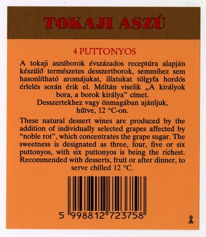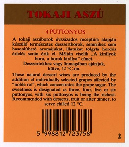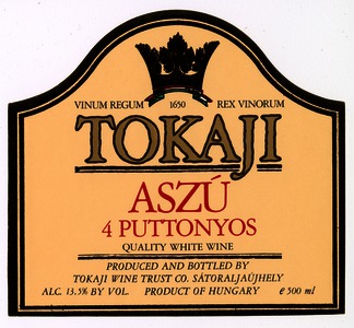 Bortípus: aszú; Termelő neve: Tokaji Wine Trust Co.; Termelő címe: Sátoraljaújhely; színes címke
