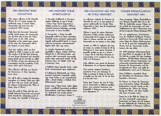 Bortípus: aszú, szamorodni; Termelő neve: Disznókő Rt.; Termelő címe: 3910 Tokaj; Évjárat: 1993; színes prospektus