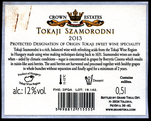 Bortípus: szamorodni; Termelő neve: Grand Tokaj Zrt.; Termelő címe: 3934 Tolcsva, Petőfi u. 36-40.; Évjárat: 2013; színes címke
