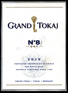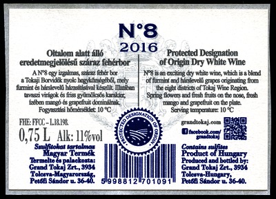 Bortípus: N°8 száraz fehérbor; Termelő neve: Grand Tokaj Zrt.; Termelő címe: 3934 Tolcsva, Petőfi Sándor u. 36-40.; Évjárat: 2016; színes címke