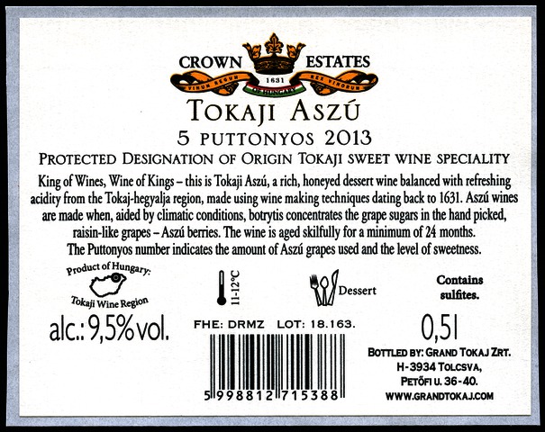 Bortípus: aszú; Termelő neve: Grand Tokaj Zrt.; Termelő címe: 3934 Tolcsva, Petőfi u. 36-40.; Évjárat: 2013; színes címke