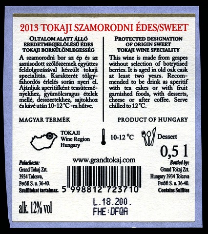 Bortípus: szamorodni; Termelő neve: Grand Tokaj Zrt.; Termelő címe: 3934 Tolcsva, Petőfi S. u. 36-40.; Évjárat: 2013; színes címke