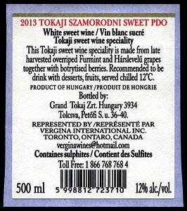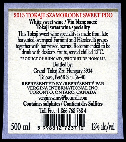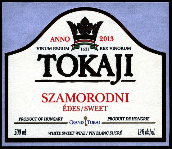 Bortípus: szamorodni; Termelő neve: Grand Tokaj Zrt.; Termelő címe: 3934 Tolcsva, Petőfi S. u. 36-40.; Évjárat: 2013; színes címke