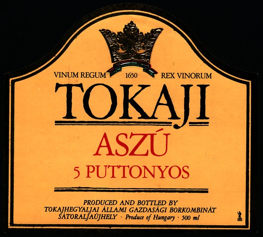 Bortípus: aszú; Termelő neve: Tokajhegyaljai Állami Gazdasági Borkombinát; Termelő címe: Sátoraljaújhely színes címke