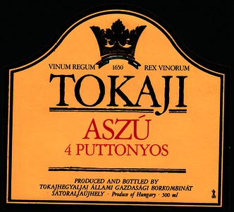 Bortípus: aszú; Termelő neve: Tokajhegyaljai Állami Gazdasági Borkombinát; Termelő címe: Sátoraljaújhely; színes címke