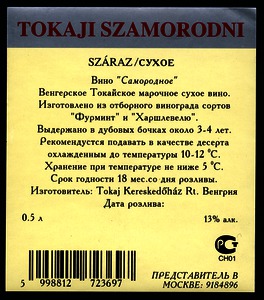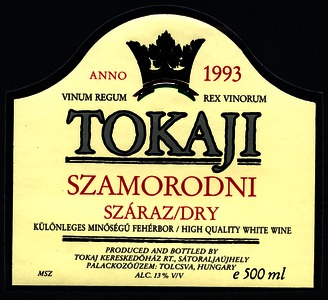 Bortípus: szamorodni; Termelő neve: Tokaj Kereskedőház Rt.; Termelő címe: Sátoraljaújhely; Évjárat: 1993; színes címke