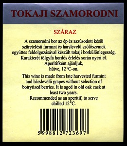 Bortípus: szamorodni; Termelő neve: Tokaj Kereskedőház Rt.; Termelő címe: Sátoraljaújhely; Évjárat: 1996; színes címke