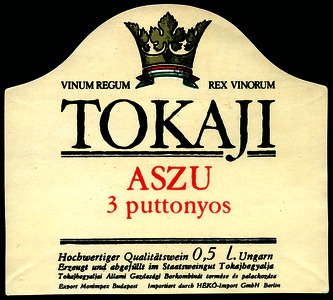 Bortípus: aszú; Termelő neve: Tokajhegyaljai Állami Gazdaság Borkombinát; Termelő címe: Sátoraljaújhely; színes címke