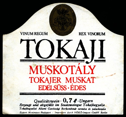 Bortípus: muskotály; Termelő neve: Tokajhegyaljai Állami Gazdasági Borkombinát; Termelő címe: Sátoraljaújhely; színes címke