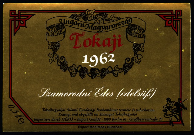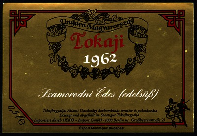 Bortípus: szamorodni; Termelő neve: Tokajhegyaljai Állami Gazdasági Borkombinát; Évjárat: 1962; színes címke