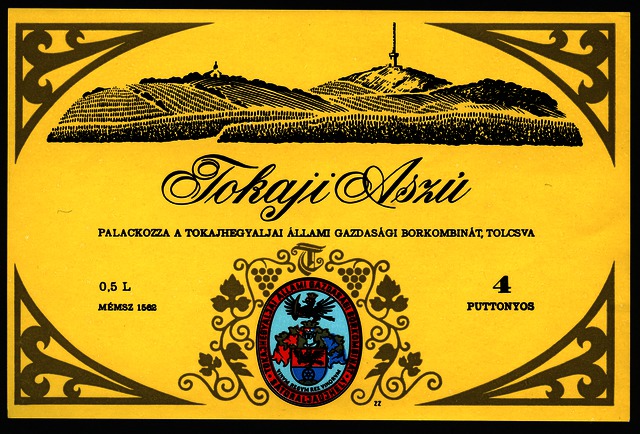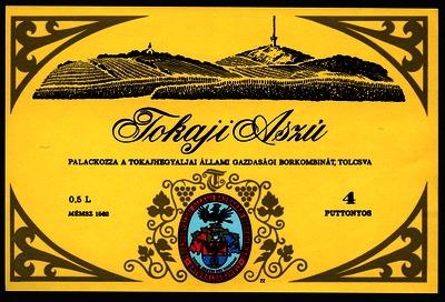 Bortípus: aszú; Termelő neve: Tokajhegyaljai Állami Gazdasági Borkombinát; Termelő címe: Sátoraljaújhely; színes címke