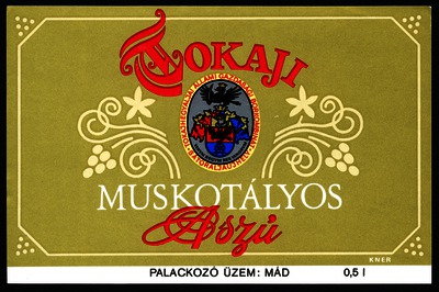Bortípus: muskotályos aszú; Termelő neve: Tokajhegyaljai Állami Gazdasági Borkombinát; Termelő címe: Sátoraljaújhely; színes címke